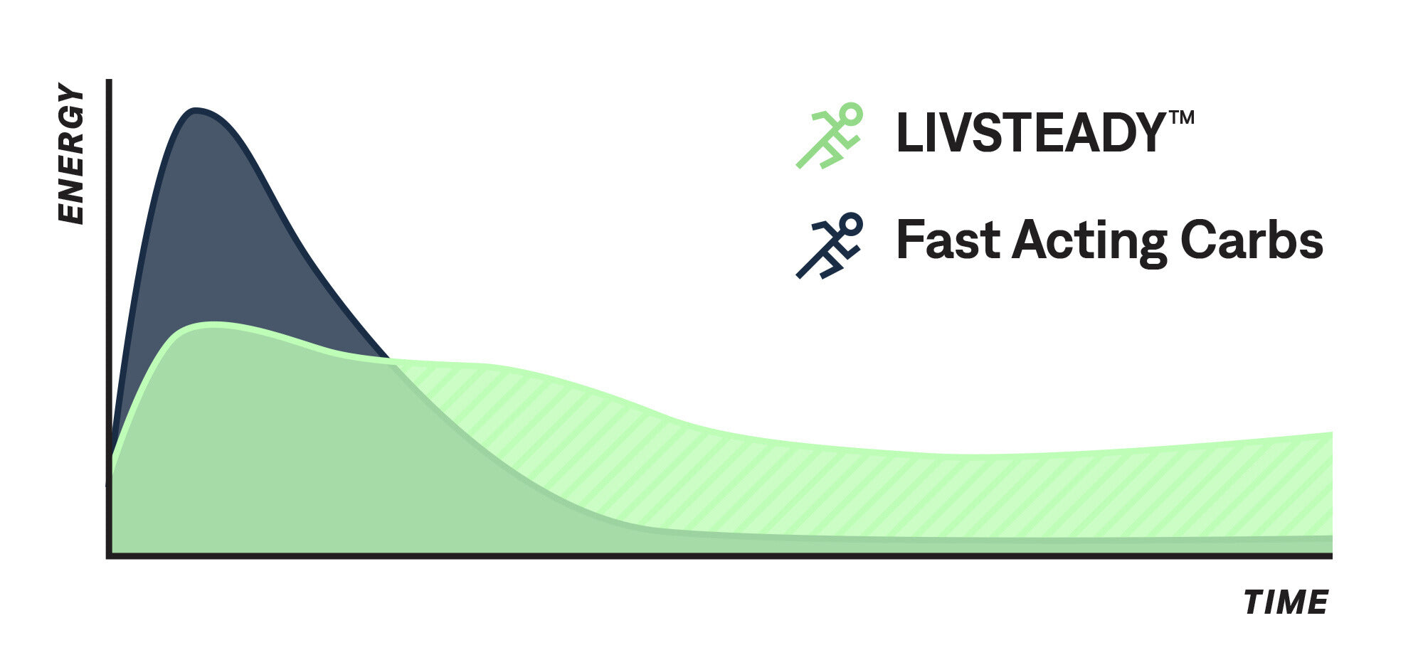 Studies have shown LIVSTEADY delivers long-lasting energy and maintains stable blood glucose levels without the highs and lows associated with sugary foods. It’s also proven in multiple clinical trials to significantly increase levels of fat burn during exercise and improve focus during activity.